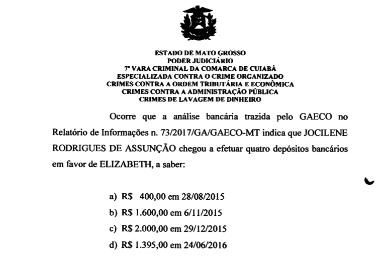 “Ora, o fato de haver prova advinda do cruzamento de dados bancários de que Elizabeth Aparecida Ugolini realmente foi beneficiada com depósitos de valores feitos por Jocilene Rodrigues de Assunção, aliado às declarações acima descritas, denota que pode estar envolvida no contexto criminoso, o que indica a necessidade de que seja adquirida a respeito, não apenas para elucidar o motivo dos depósitos, mas também para esclarecer seu eventual envolvimento”, disse a juíza.