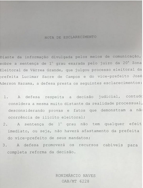Em nota, a defesa da prefeita Lucimar, representada pelo advogado Ronimárcio Naves afirmou respeitar a decisão, mas considerou-a “muito distante da realidade processual”.