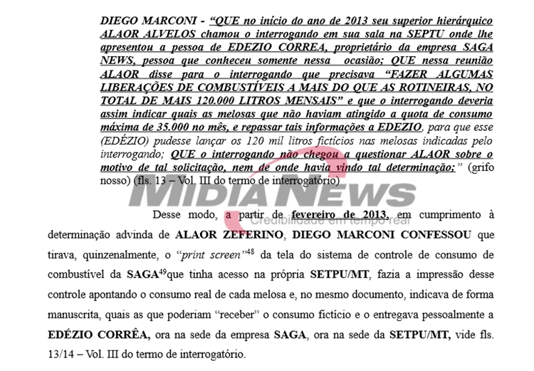 “Após receber a determinação por parte de Valdísio Viriato para executar o esquema fraudulento, Alaor Zeferino marcou um encontro no qual, participaram: Diego Marconi e Edézio Corrêa, oportunidade em que Alaor afirmou à Diego que precisava ‘fazer algumas liberações de combustíveis a mais do que as rotineiras, no total a mais de 120.00 litros mensais’”, descreveu a promotora de Justiça Ana Cristina Bardusco, em trecho da denúncia.