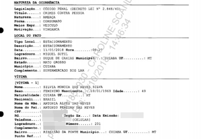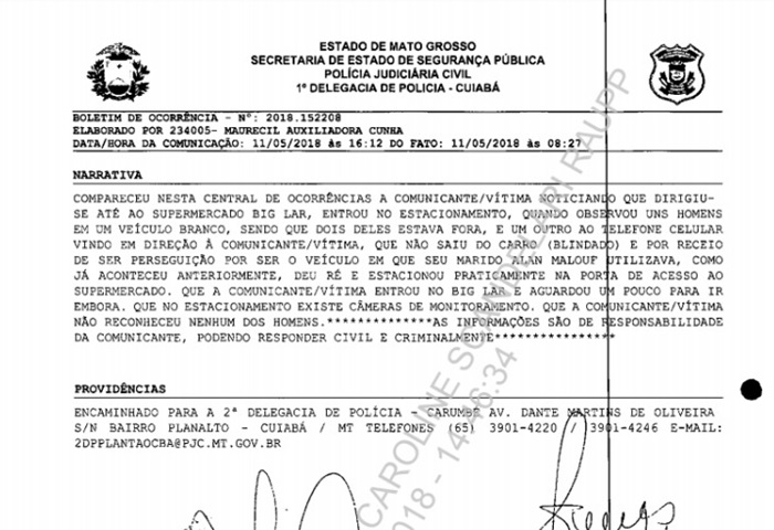 A esposa do empresário Alan Malouf, Silvia Mônica das Neves Silva, registrou um boletim de ocorrência relatando ter sido vítima de ameaça no estacionamento do supermercado Big Lar, na Avenida Miguel Sutil, em Cuiabá.