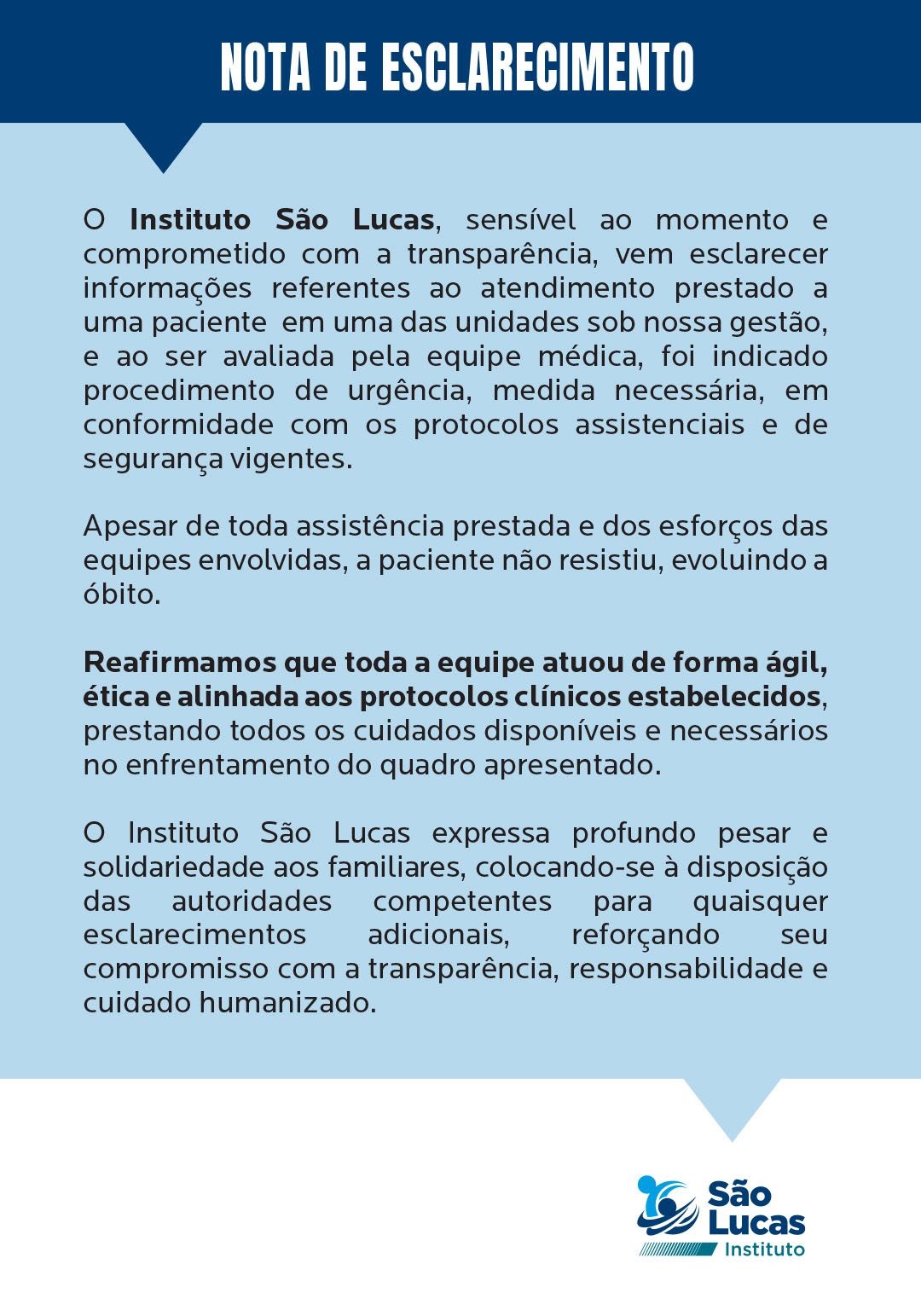 “Apesar de toda assistência prestada e dos esforços das equipes envolvidas, a paciente não resistiu, evoluindo a óbito. Reafirmamos que toda a equipe atuou de forma ágil, ética e alinhada aos protocolos clínicos estabelecidos, prestando todos os cuidados disponíveis e necessários no enfrentamento do quadro apresentado”, diz trecho da nota.