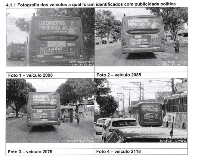 A publicidade, afixada em veículos das empresas Rápido Cuiabá Transporte Urbano Ltda. e VPAR Transportes e Serviços SPE Ltda., trazia a foto do parlamentar acompanhada da frase “Loteamentos populares já!”, em referência ao Contorno Leste. Ônibus com os anúncios foram vistos circulando pela cidade nos últimos dias.