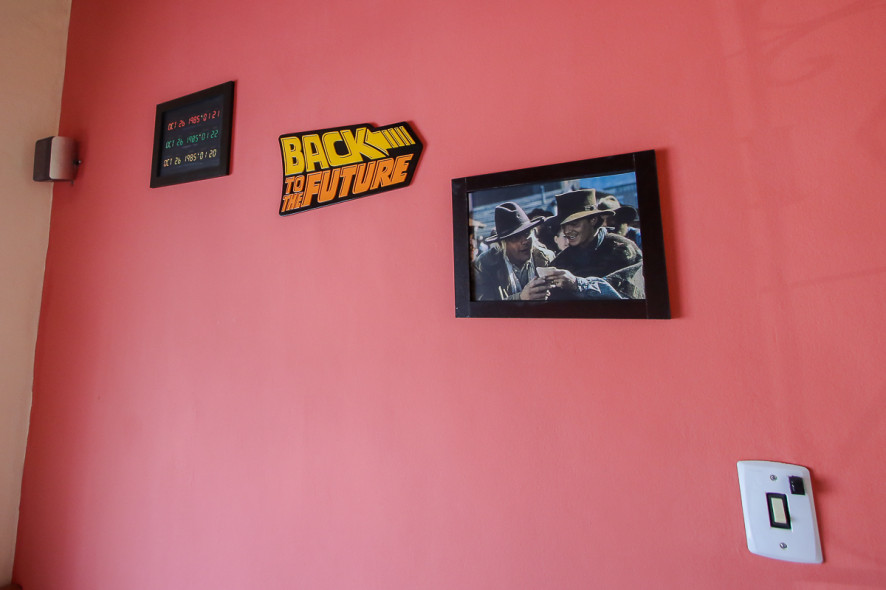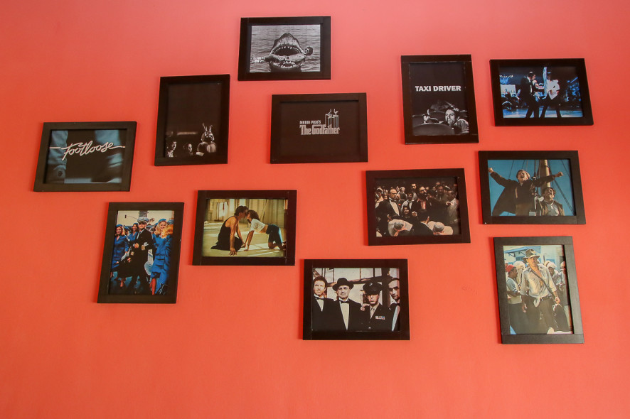 A parede é ilustrada com quadros de filmes que marcaram época, como “Taxi Driver”, de 1976, e “O Poderoso Chefão”, de 1972.