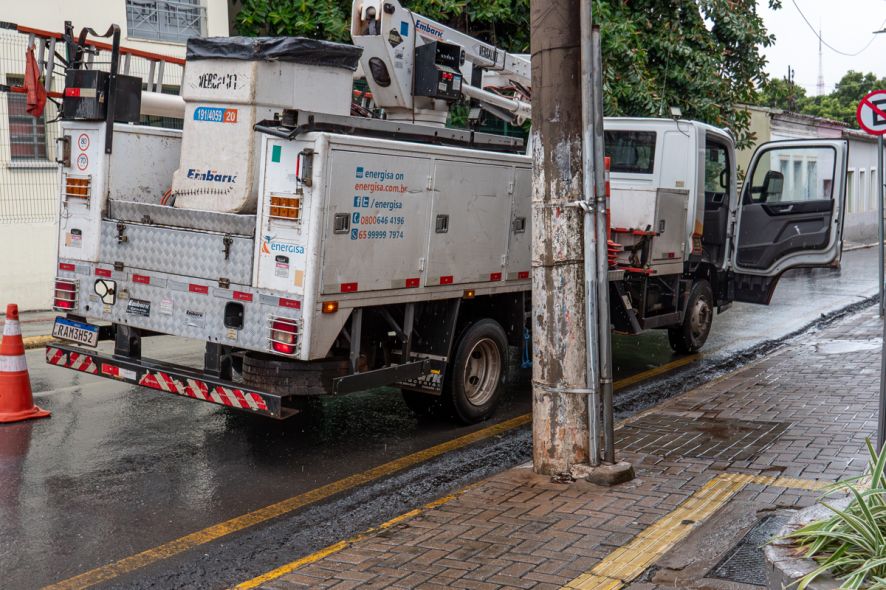 De acordo com a Energisa, por conta das fortes rajadas de vento durante a chuva, galhos de árvores foram lançados na rede elétrica da Av. Cândido Mariano, próximo a prefeitura.
