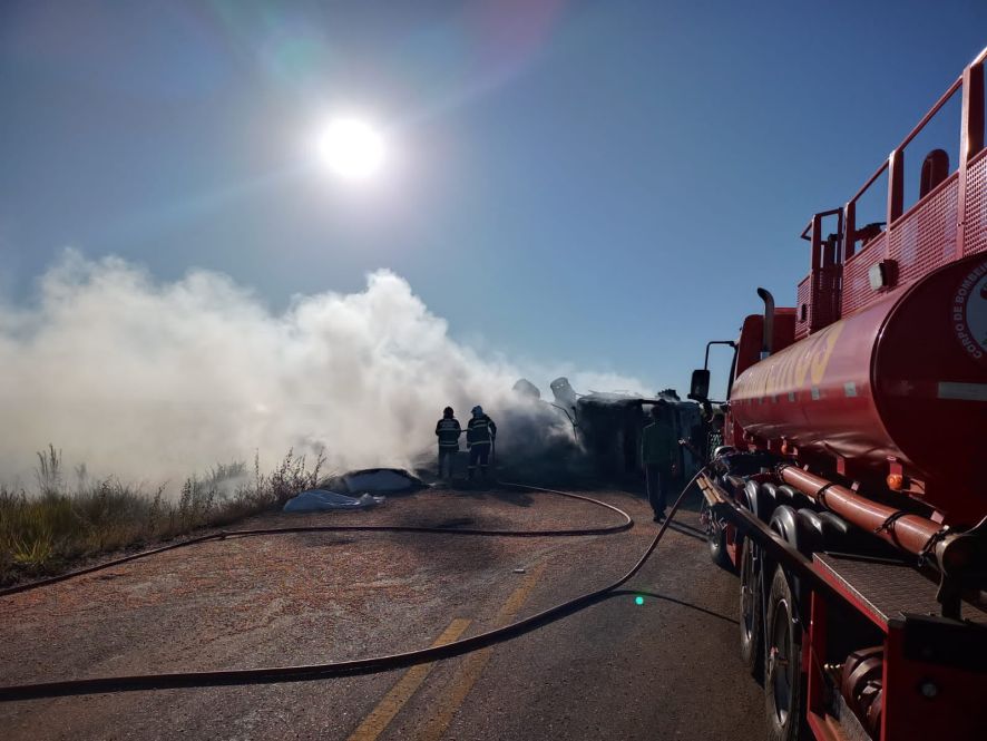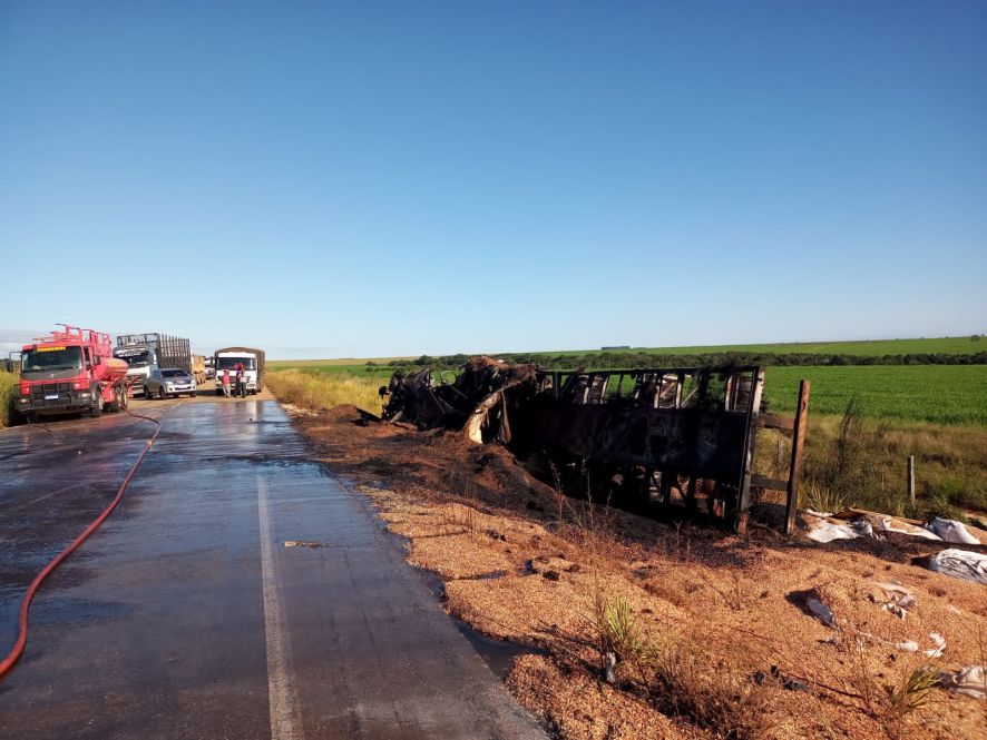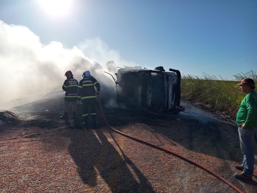 Uma carreta tombou e pegou fogo na MT-130, em Primavera do Leste (383 km de Cuiabá), na quinta-feira (27). O tráfego da via foi prejudicado pois o veículo ocupou as duas pistas.