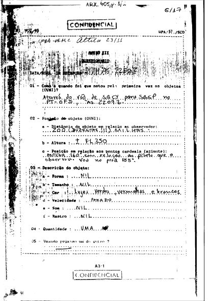 “O observador conduzia a aeronave na rota Sinop [MT]-Campinas [SP], FL 390 [a 39 mil pés] quando avistou o OVNI no seu horizonte, 20º acima. Segundo o observador, muito acima do FL 400 [nível de 40 mil pés]. O objeto realizava movimentos circulares, tinha forma semelhante a uma estrela ou um farol, emitia luz branca e por vezes tinha cor de uma sombra avermelhada”, diz ele no documento.