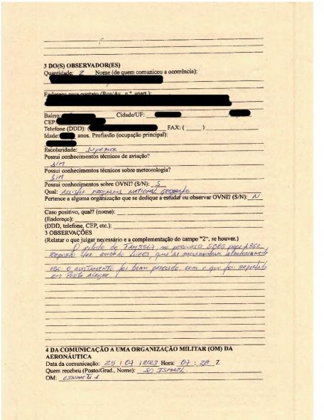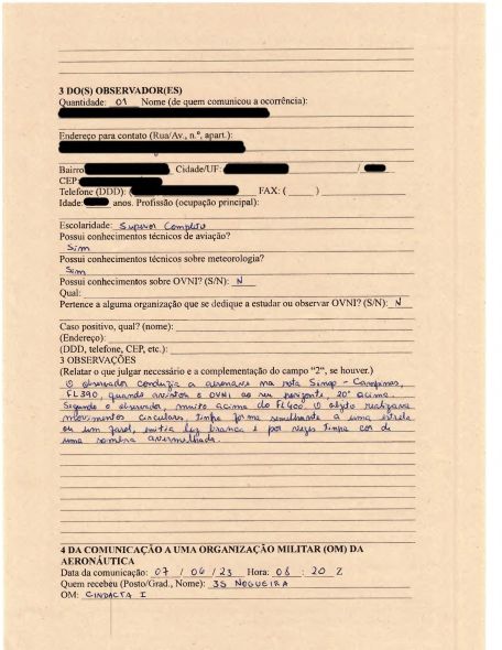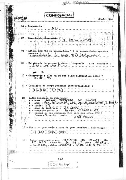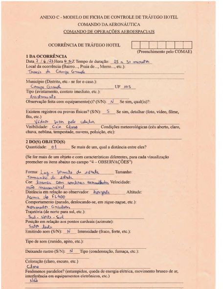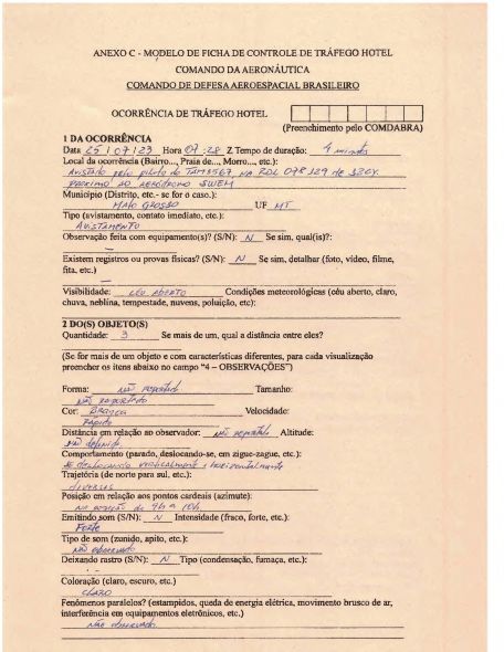 Este é um dos 30 documentos com relatos de pilotos brasileiros relatando avistamento de OVNIs nos céus do país e divulgados este mês.