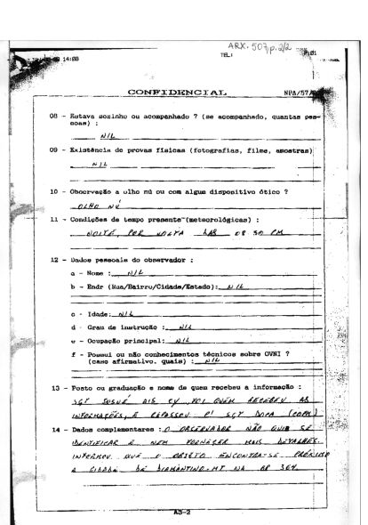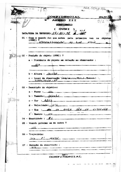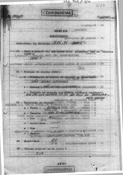 Já em um questionário, que na época também foi tratado como “Confidencial”, feito em janeiro de 1998, um morador afirmou ter visto um objeto que teria caído em Diamantino. Quem relatou disse que o OVNI tinha cor azul e provocou um estrondo na queda. O objeto estaria próximo a Diamantino, na BR-364.
