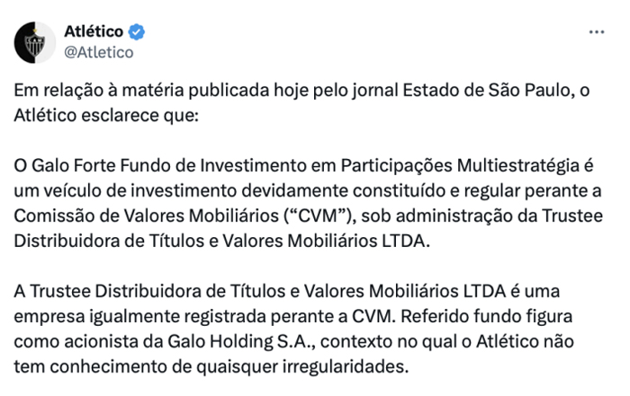 A direção alvinegra classificou as recentes especulações como “infundadas e desconectadas da realidade regulatória”, destacando que o Galo Forte FIP está devidamente registrado e supervisionado pela Comissão de Valores Mobiliários (CVM).