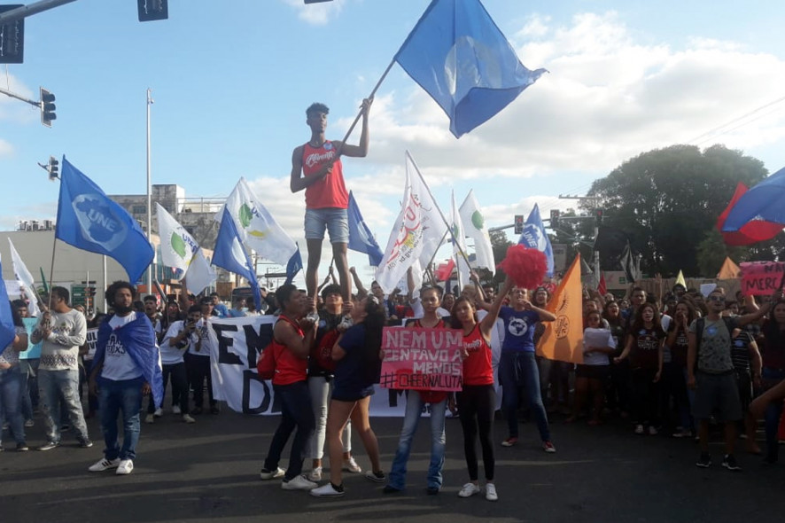 O protesto - que também acontece em vários municípios brasileiros - reúne em Cuiabá pelo menos 5 mil estudantes das redes municipal, estadual e federal, segundo a Polícia Militar e o Sindicato dos Trabalhadores do Ensino Público de Mato Grosso (Sintep-MT).