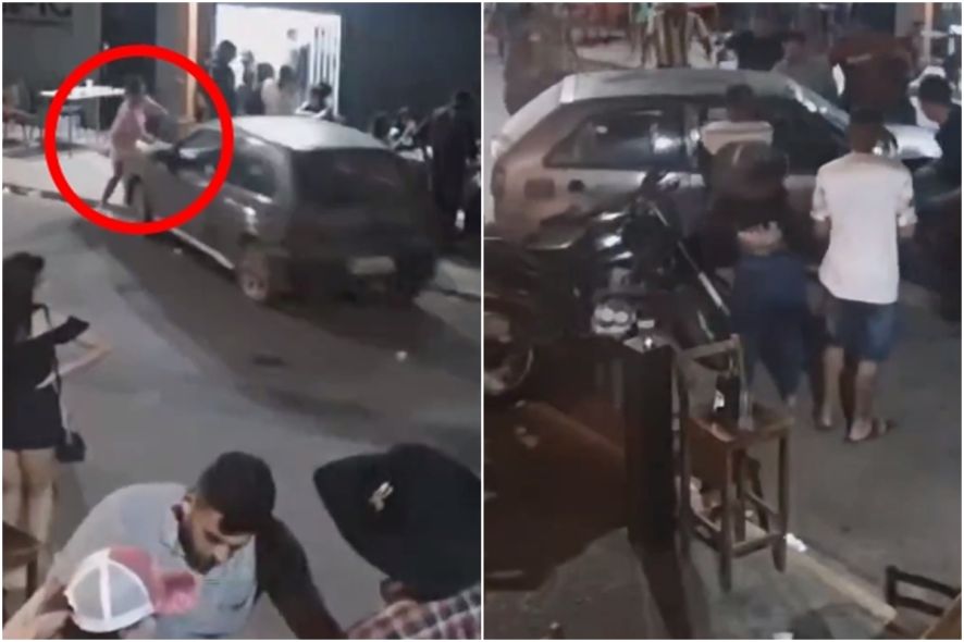 Pelas imagens, é possível ver o momento em que o Volkswagen Gol avança sobre a calçada do estabelecimento, atingindo várias pessoas.