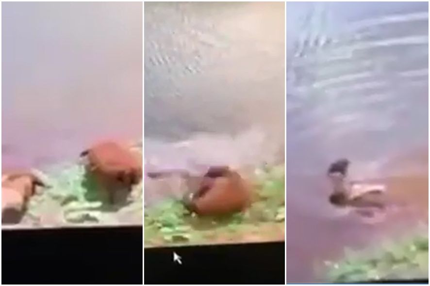 O animal estava na beira do lago se refrescando quando foi surpreendido.