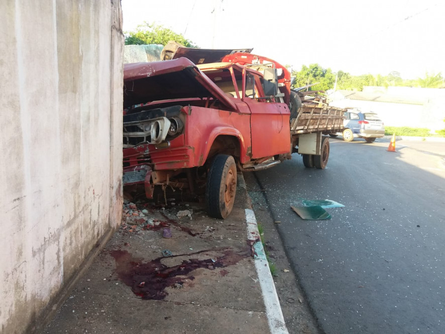 Marcas de sangue podiam ser vistas no chão após o acidente e o veículo ficou com a frente completamente destruída.