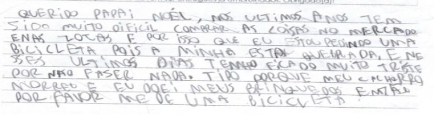 “Nos últimos anos tem sido muito difícil comprar as coisas no mercado e nas lojas, por isso estou pedindo uma bicicleta”, diz P.M.X.A., de 10 anos, ao contar que se sente triste nos últimos dias. “Meu cachorro morreu e eu doei meus brinquedos. Por favor me dê uma bicicleta”, reforça o pedido.