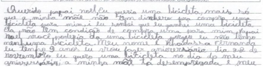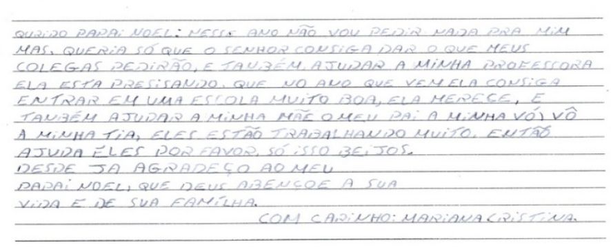 “Nesse ano não vou pedir nada pra mim, mas queria só que o senhor consiga dar o que meus colegas pedirão e também ajudar a minha professora. Ela precisa entrar em uma escola muito boa, ela merece”, diz a pequena, pedindo também pelos seus familiares.