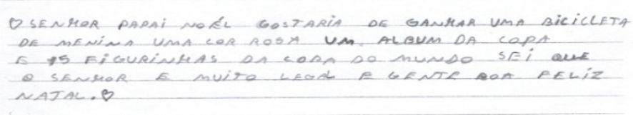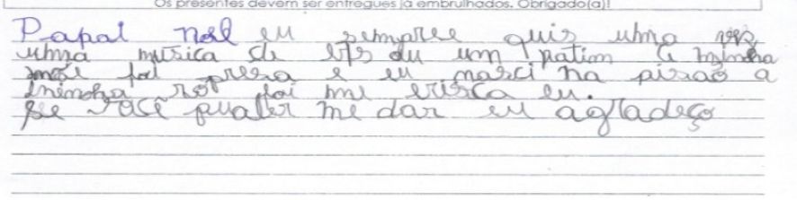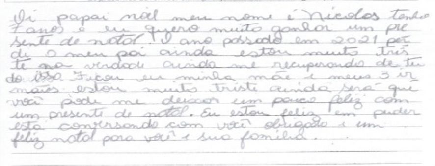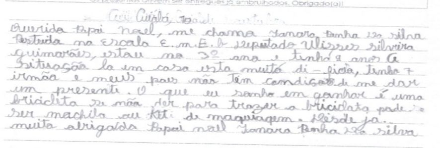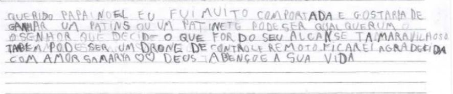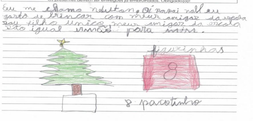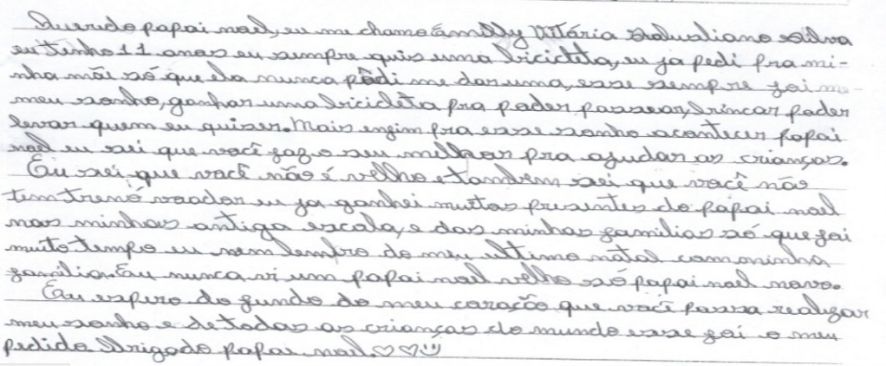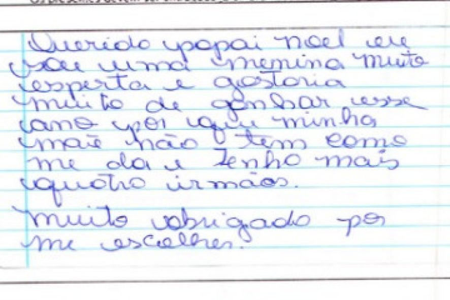 Outra pequena que sonha com o brinquedo é E.V.S., de 11 anos. “Eu sei que você faz o seu melhor para ajudar as crianças. Eu sei que você não é velho e também sei que você não tem trenó voador”, diz a pequena após desabafar com o “Sr. Noel”, demonstrando a ele empatia pela difícil tarefa de salvar o Natal de tantos.
