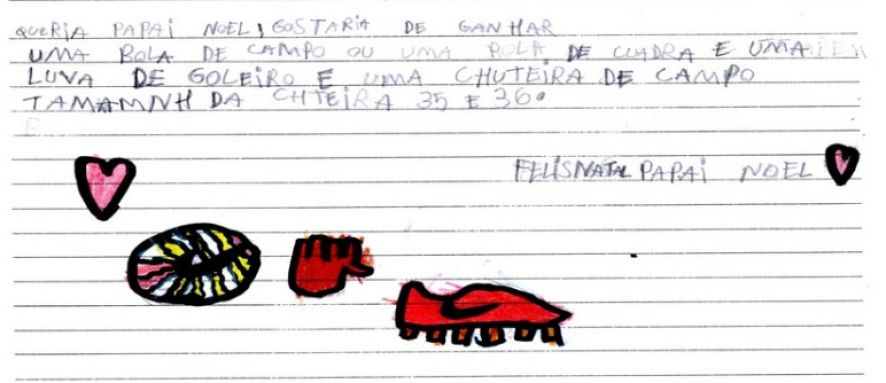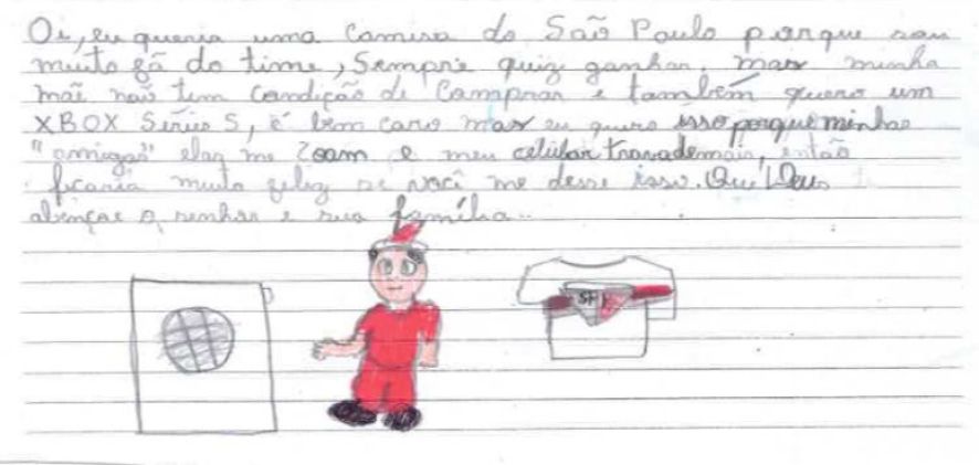 Dois pedidos são feito na cartinha de L.Z.S. um é a camisa do seu time do coração, o outro motivado pelo bullying das colegas.