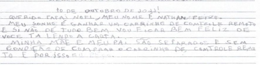 N.P.R. de 10 anos, conta que seu sonho é ganhar um carrinho de controle remoto, mas que se não der ele fica feliz somente em ter a sua cartinha lida.
