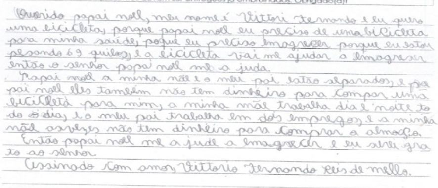 “Preciso de uma bicicleta para a minha saúde, estou pesando 69 quilos e a bicicleta vai me ajudar a emagrecer, então, senhor Papai Noel, me ajuda”. diz o garoto.