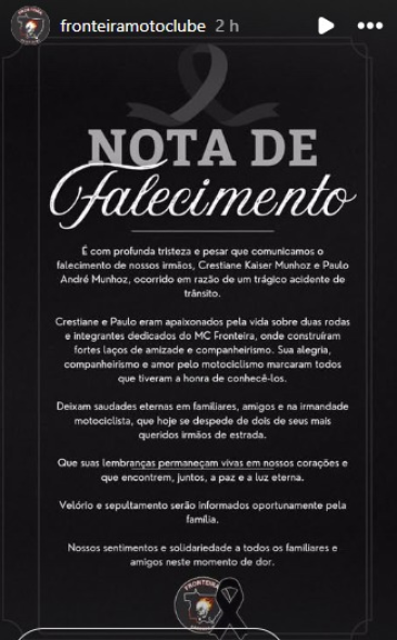 "Cristiane e Paulo eram apaixonados pela vida sobre duas rodas e integrantes dedicados do MC Fronteiras, onde construíram fortes laços de amizade e companheirismo. Sua alegria, companheirismo e amor pelo motociclismo marcaram todos que tiveram a honra de conhecê-los", dizia trecho da nota.