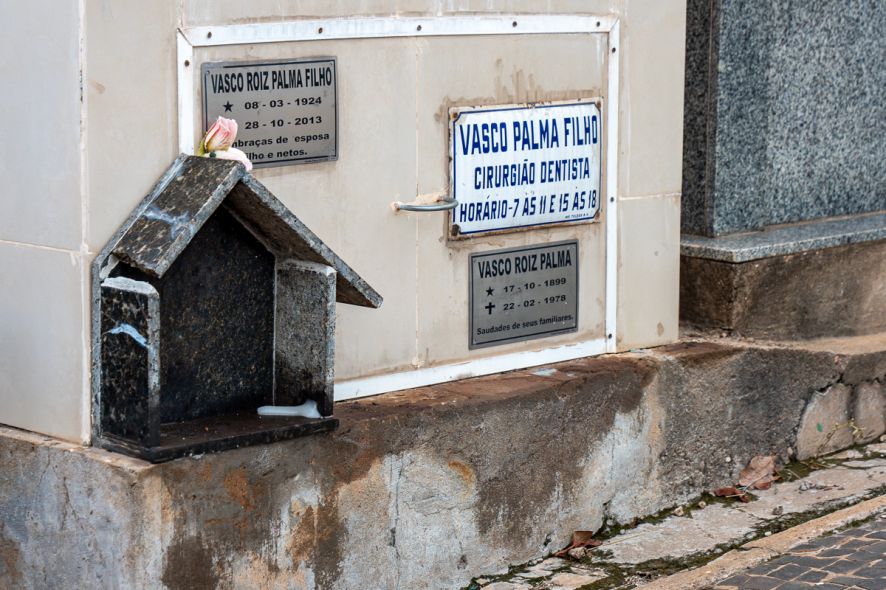 Outro túmulo destacado pelo gestor é o do cirurgião-dentista Vasco. Após sua morte, em 1978, o filho deixou no local a antiga placa profissional utilizada pelo pai, como forma de homenagem e memória.