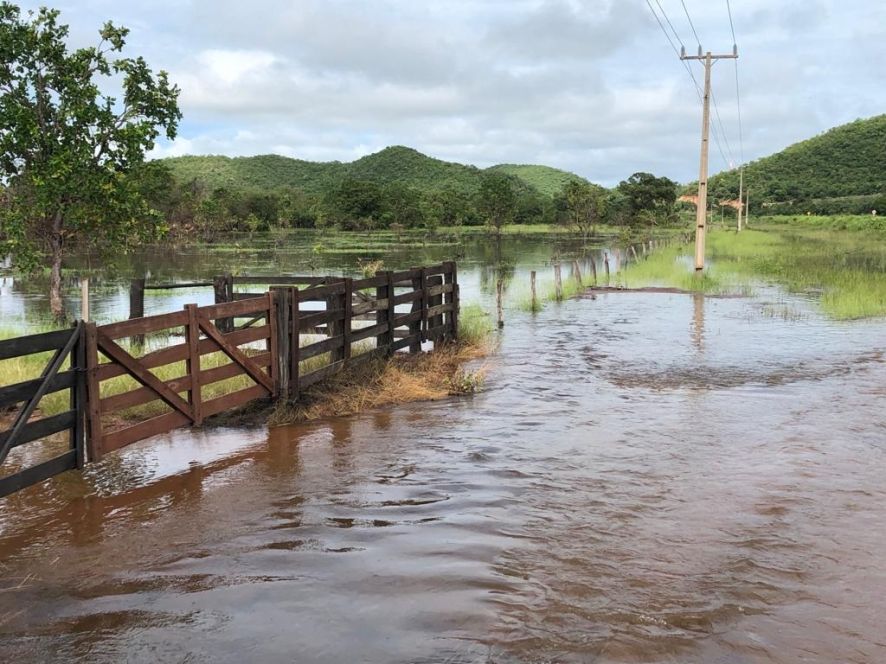 Em Gaúcha do Norte, estradas e propriedades ficaram em baixo d’água. Um dos registros mostra equipes da Energisa trabalhando para reestabelecer o fornecimento de energia na região, com água até a altura dos joelhos.