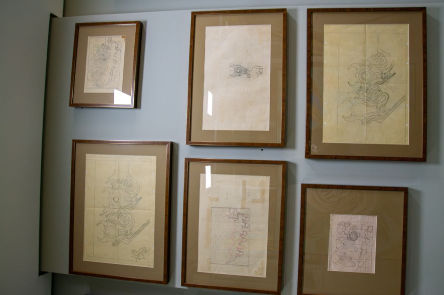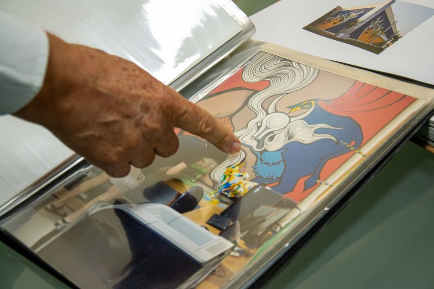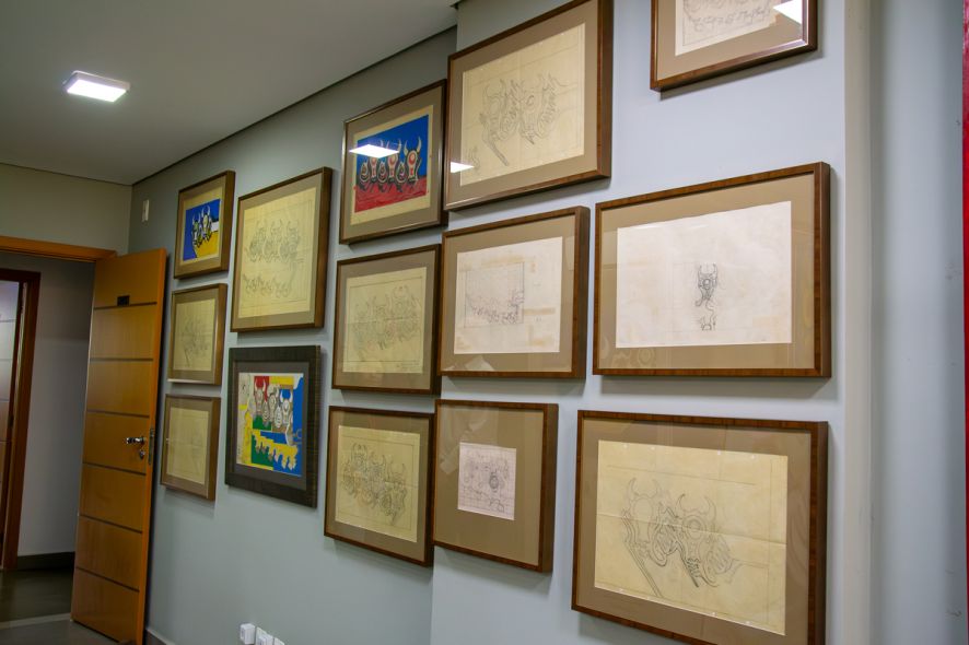 Uma das joias do acervo são os esboços que o artista plástico Humberto Espíndola fez para a obra “Bovinocultura”, painel histórico que enriquece a fachada do Palácio Paiaguás, sede do Governo do Estado.