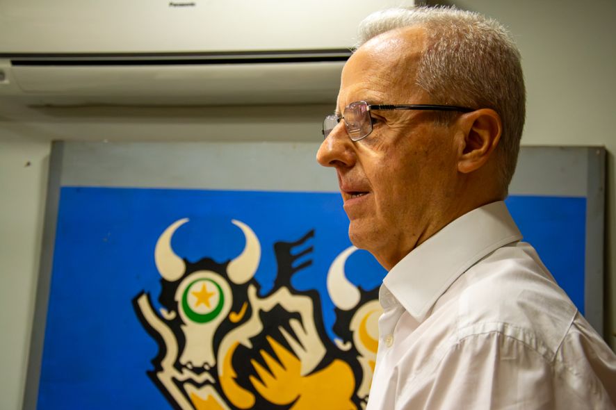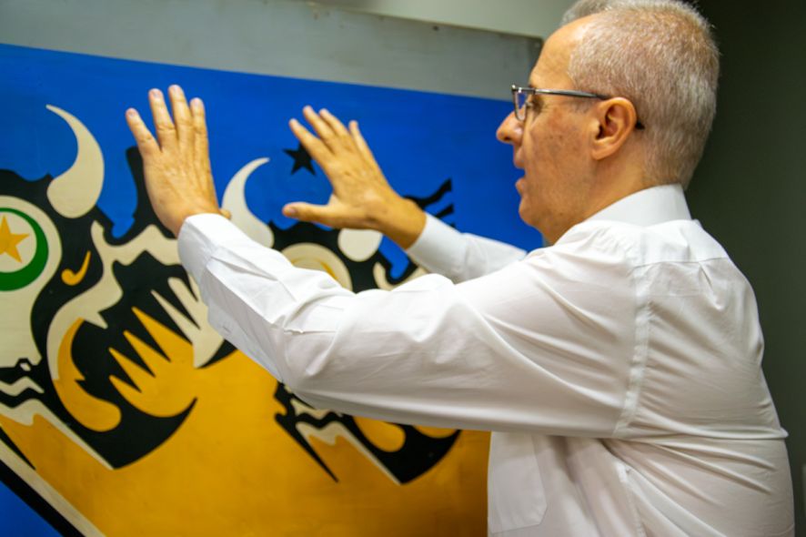 “Fizeram este aqui com a ideia do vermelho, que representa calor, terra, sol e força, e do azul, que simboliza o céu. Mas era 1974, época da ditadura militar, e o vermelho estava associado ao comunismo. Então fizeram outra versão com as cores da bandeira de Mato Grosso. Ficou esta, aprovada”, conta ele, enquanto mostra as peças.