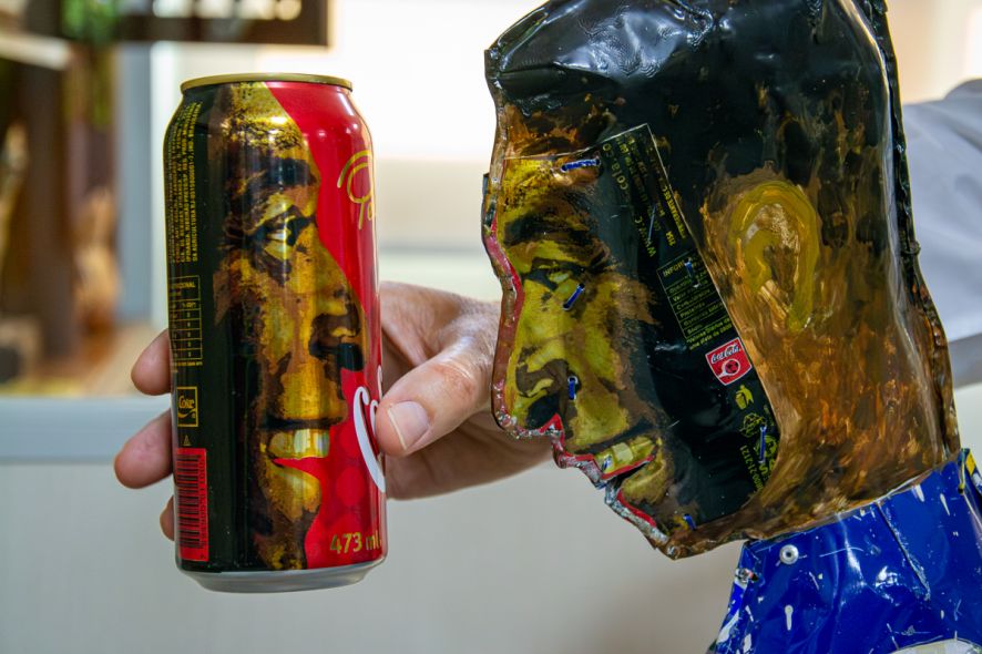 Escultura do Rei Pelé, criado a partir de lata de Coca-Cola