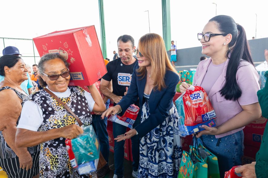 A primeira-dama de Cuiabá e vereadora Samantha Iris acompanhou, nesta quarta-feira (17), a distribuição de cestas básicas e kits natalinos para famílias em situação de vulnerabilidade social, ao lado da primeira-dama do Estado, Virginia Mendes. A ação contou ainda com a presença do prefeito Abilio Brunini e integra o programa SER Família Solidário, idealizado e coordenado pelo Governo do Estado de Mato Grosso.