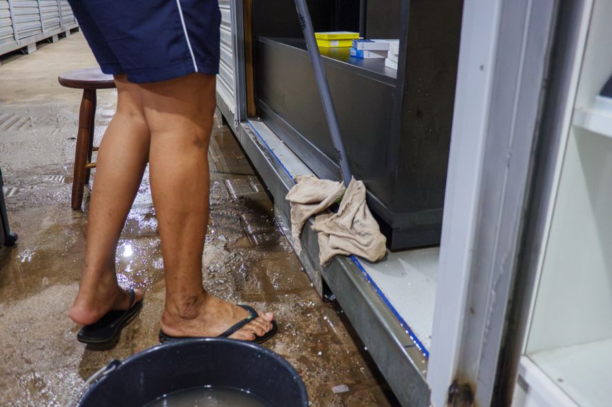 A reportagem esteve no local na manhã desta quarta-feira (9), quase um dia após o temporal de terça (8), e viu corredores vazios de clientes e trabalhadores puxando a água que restou de um lado para o outro.