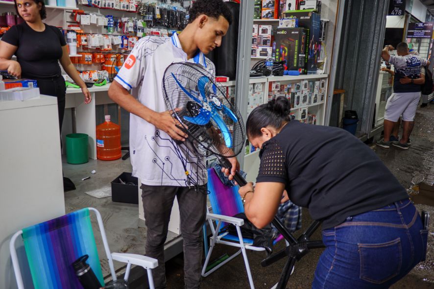 Apesar dos danos causados pela inundação, Jô e outros comerciantes afirmam que os estragos não chegam perto da tragédia de 15 de julho de 2024, quando o shopping pegou fogo. “Depois do que aconteceu, esse aqui para gente é o menor de todos os danos. Da outra vez perdemos tudo. Mezanino, de cima a baixo, estoque de cima a baixo”.