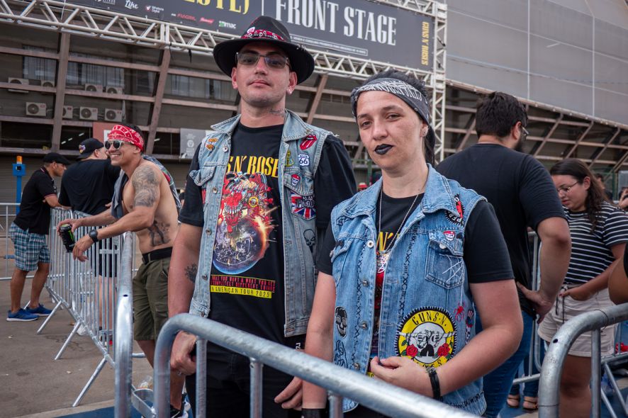 All black, correntes, spikes, bandana, camiseta do Guns e, claro, coturnos. Esses são os elementos que mais se repetem nos looks dos fãs que aguardam na fila para ver o show da banda de rock Guns N’ Roses, que se apresenta nesta sexta-feira (31) na Arena Pantanal.