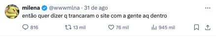 “Então quer dizer que trancaram o site com a gente aqui dentro?”, escreveu a influenciadora.