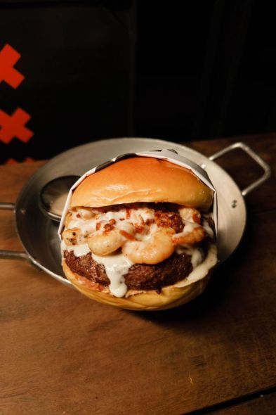 Uma das novidades é o lanche Classic Surf, disponível apenas às segundas e terças-feiras. "É o Classic surf, que é a mistura de frutos do mar com coisas da terra, carne bovina com camarão, queijo gouda e farofa de bacon crocante", detalha.