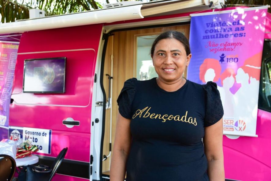 Moradora do Distrito Ranchão, em Nova Mutum (292 km de Cuiabá), Aline Dias destacou as ações do Governo de Mato Grosso em defesa das mulheres, durante a Expedição SER Família Mulher - MT Por Elas, que leva atendimentos itinerantes com a van do Programa SER Família Mulher, idealizado pela primeira-dama do Estado, Virginia Mendes, e coordenado pela Secretaria de Estado de Assistência Social e Cidadania (Setasc).
