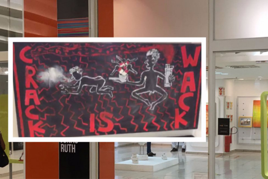 Uma das pinturas retrata dois usuários de drogas nus em um fundo preto, com os dizeres "Crack is Wack" (o crack é loucura), enquanto utilizam entorpecentes.