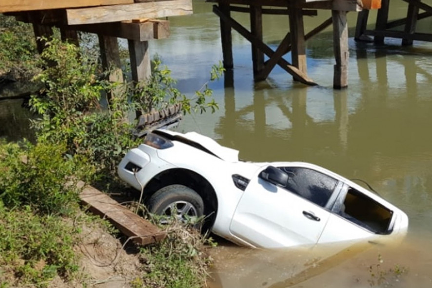A Ford Ranger de cor branca estava submersa no rio, próximo a uma ponte, com a parte da frente danificada. No entanto, dentro do veículo não havia ninguém.
