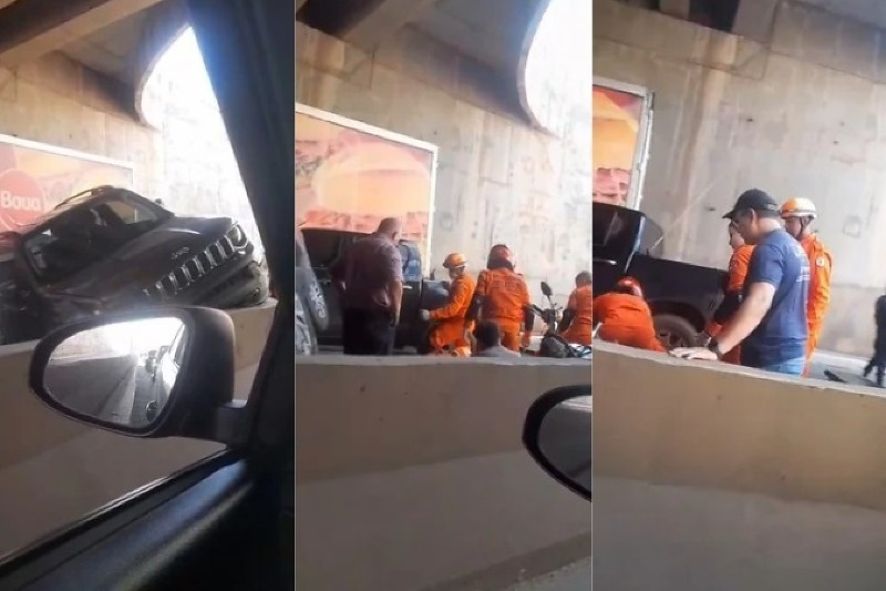 A colisão envolveu um Fiat Fiorino, um Jeep Renegade, uma caminhonete Toyota Hilux e duas motocicletas. Nas imagens, é possível ver que o Jeep foi parar parcialmente em cima da barreira de concreto que divide as pistas.