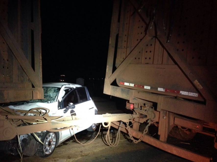 Por causa do impacto, o veículo ficou imprensado no caminhão.