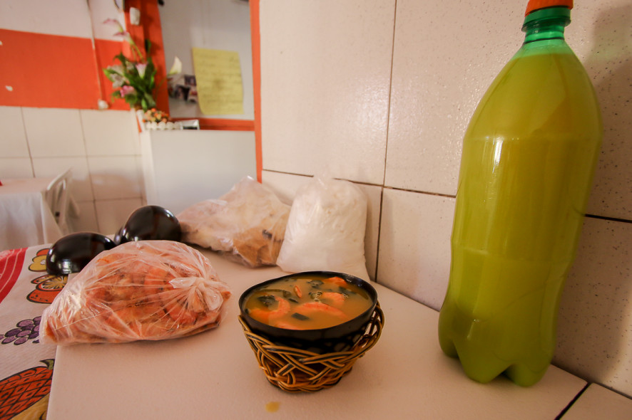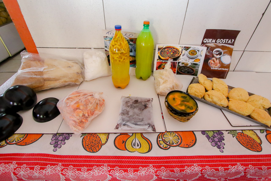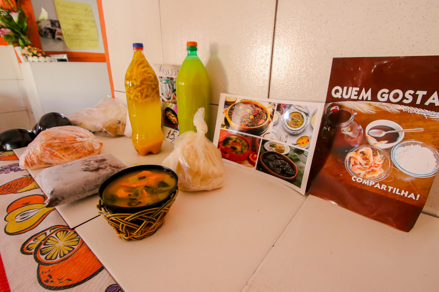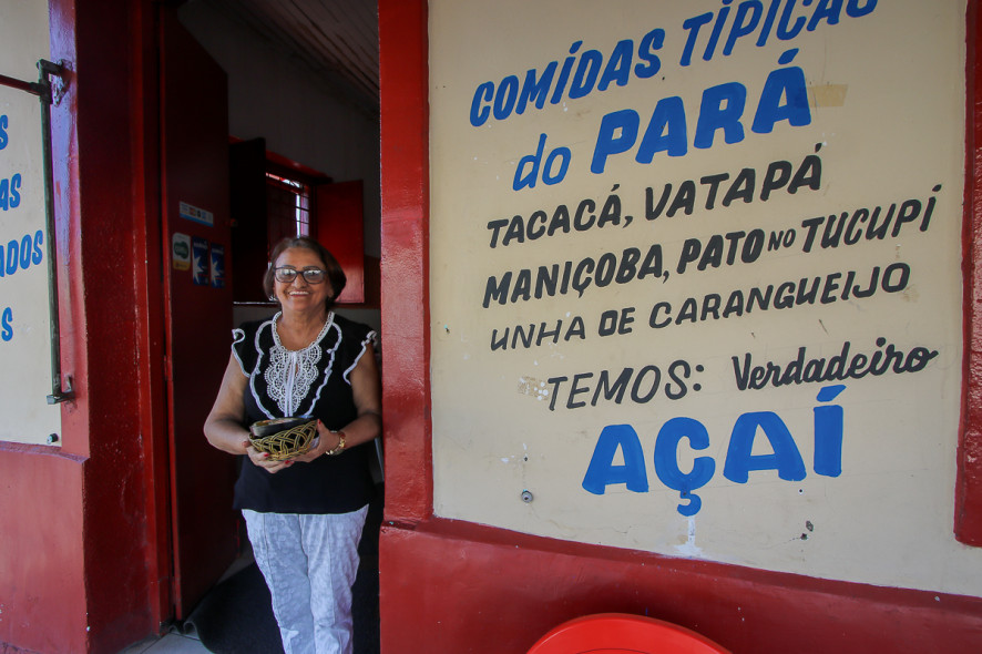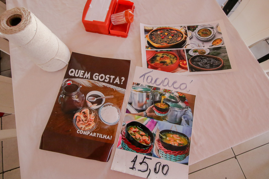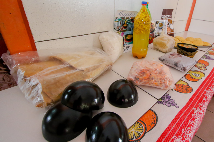 O estabelecimento vende suas iguarias para viagem. “Temos jambu, tucupi, camarão seco, cupuaçu e açaí. Tudo para levar pra casa”.