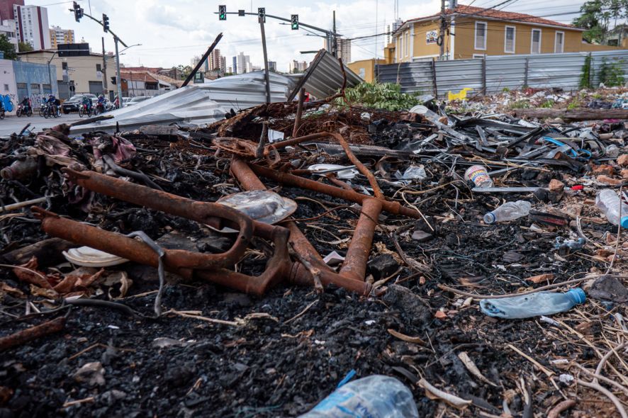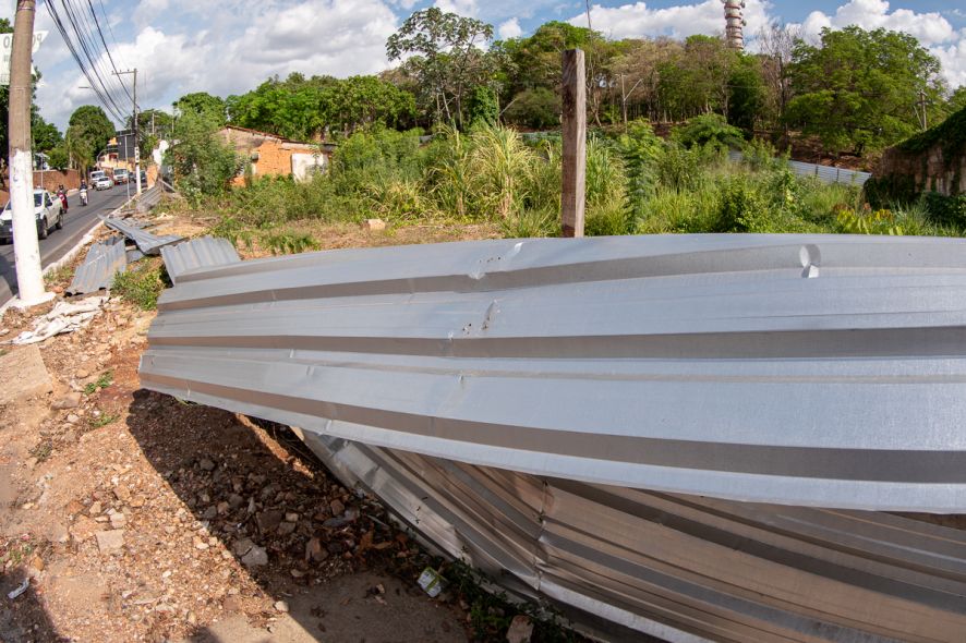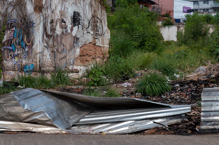Os tapumes metálicos que foram colocados para cobrir a área e impedir a entrada de pessoas estão parcialmente arrancados. A outra parte está caída no chão, sem função para além do aumento do entulho.