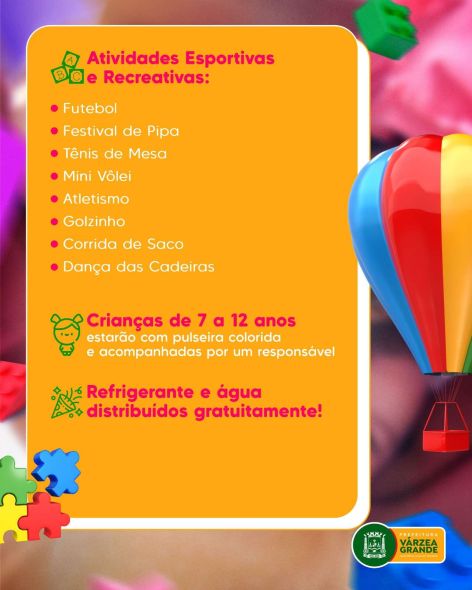 A Prefeitura de Várzea Grande, por meio da Secretaria de Educação, Cultura, Esporte e Lazer (SMECEL) – via Superintendência Municipal de Esporte e Lazer - preparou uma programação especial para celebrar o Dia das Crianças, que será realizado no próximo domingo (12), das 7h30 às 12h, no espaço Seis Campos, localizado na região do Grande Cristo Rei.