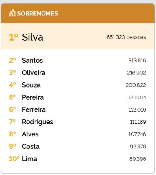 Já entre os sobrenomes, o mais comum no país é Silva, presente em mais de 34 milhões de pessoas.
