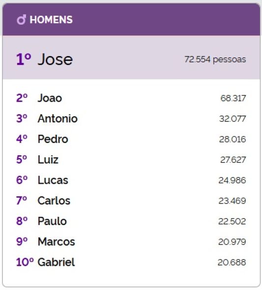 Em segundo lugar aparece João (68.317 registros), seguido por Antônio (32.077), Pedro (28.016), Luiz (27.627), Lucas (24.986), Carlos (23.469), Paulo (22.502), Marcos (20.979) e, em décimo lugar, Gabriel (20.688).