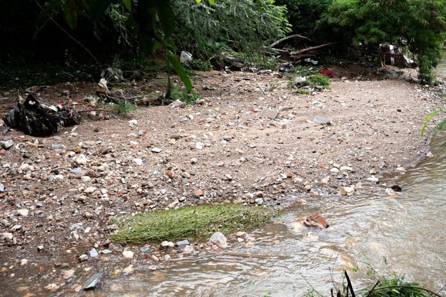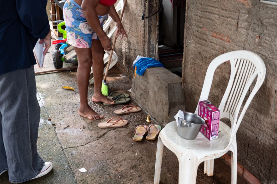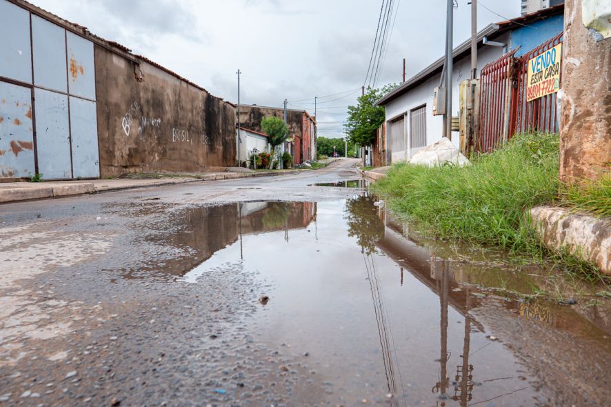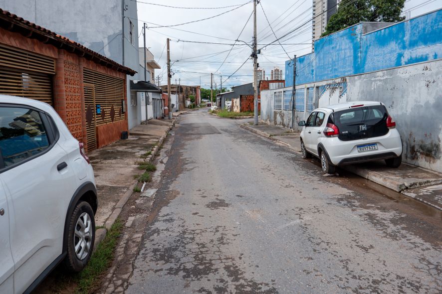Na Rua Rosário Oeste, a equipe encontrou a feirante Jeanne Figueiredo, de 54 anos, com mangueira e rodo, ainda tentando retirar o rastro de lama deixado pela chuva. Há 11 anos na residência, essa é a segunda enchente que ela enfrenta, tendo perdido “tudo” na que atingiu Cuiabá no dia 8 de abril, aniversário da cidade, do ano passado.
