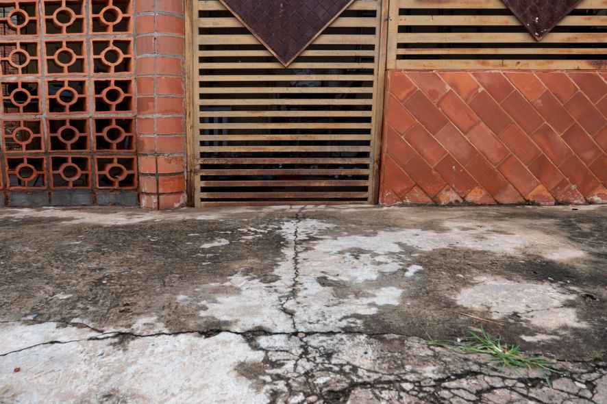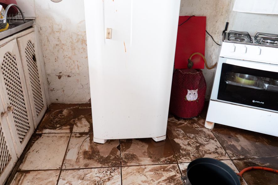 A porta, desde a última enchente, ganhou uma barreira de contenção em concreto, que ajuda a evitar que a água entre. No entanto, quando o nível ultrapassa a altura da mureta, ela impede que a água saia.