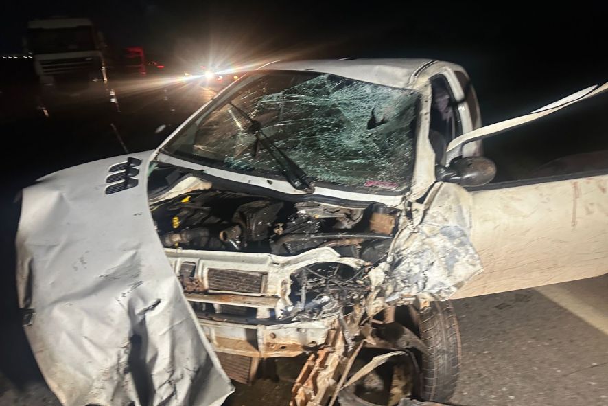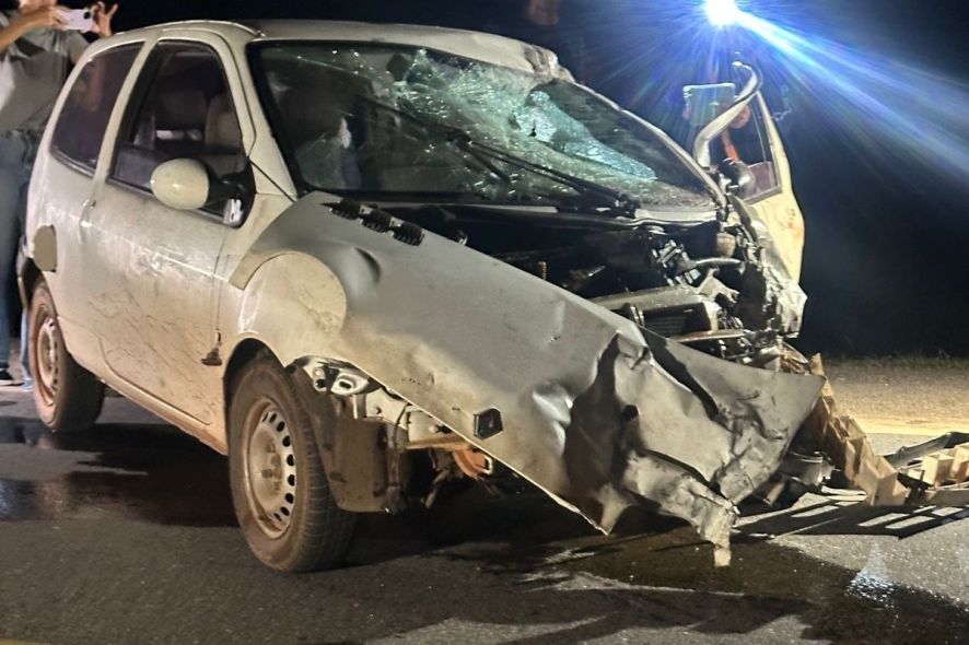 Em imagens registradas no local do acidente é possível ver o veículo Renault Twingo parcialmente destruído após o impacto da colisão.