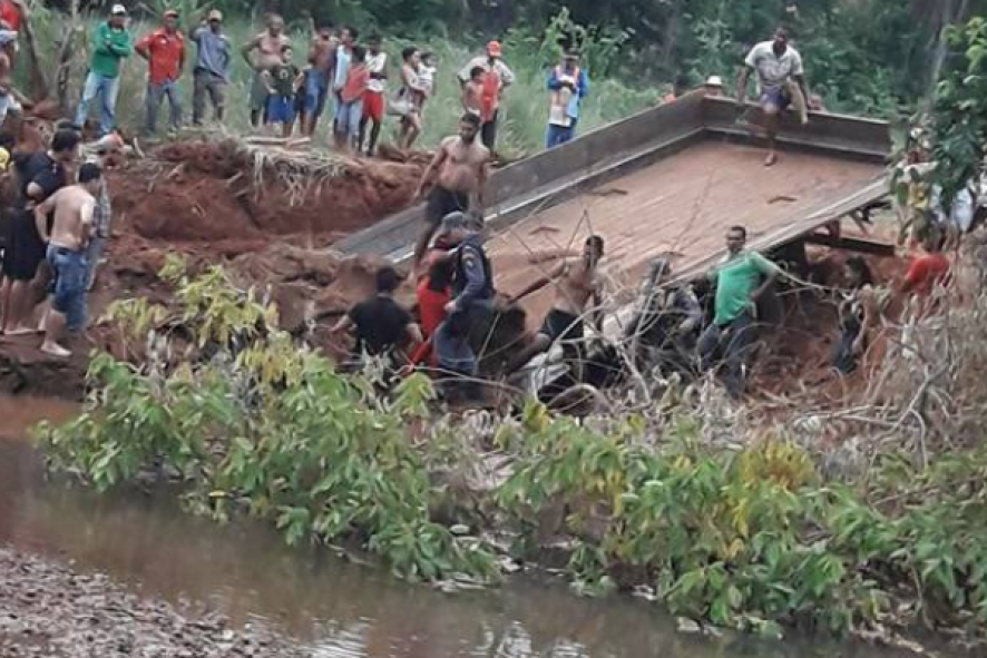 Pelo fato do caminhão cair de “bico”, a cabine do caminhão ficou submersa na água e a carga caiu por cima, soterrando o motorista.