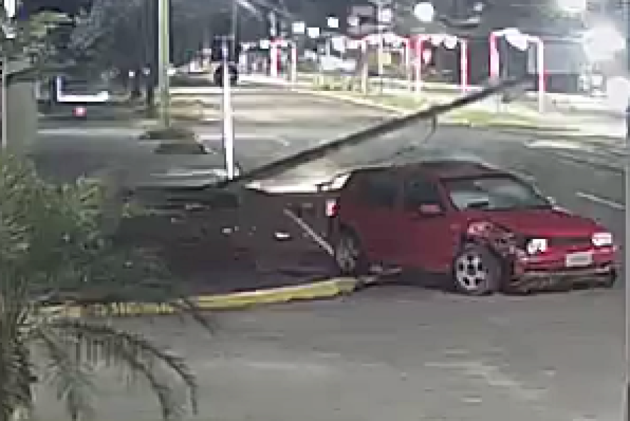 Um VW Golf vermelho atingiu e derrubou um poste na madrugada de terça-feira (10), em Sorriso (397 km de Cuiabá). Uma câmera da rua gravou o acidente.